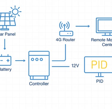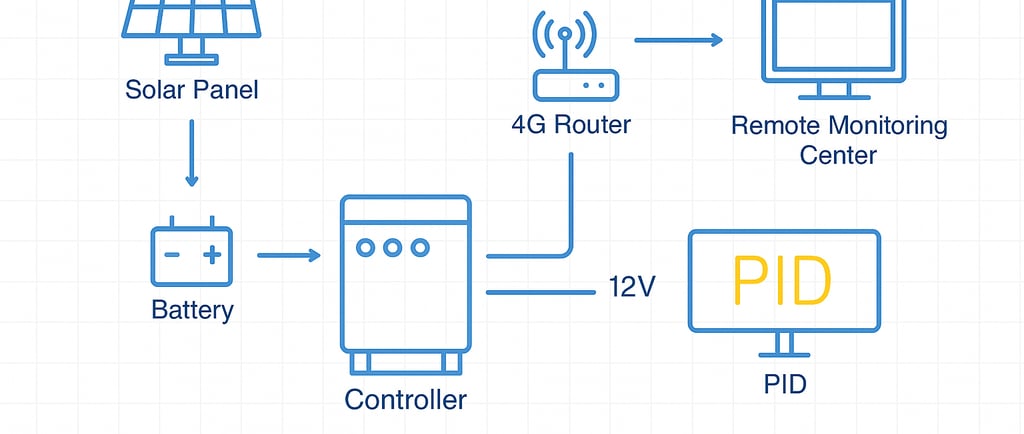 A smart controller manages dual power input (solar + AC 110–230V), battery charge/discharge, and output to the PID. The controller also connects to a 4G router, enabling remote monitoring and management from a central system via the mobile network.